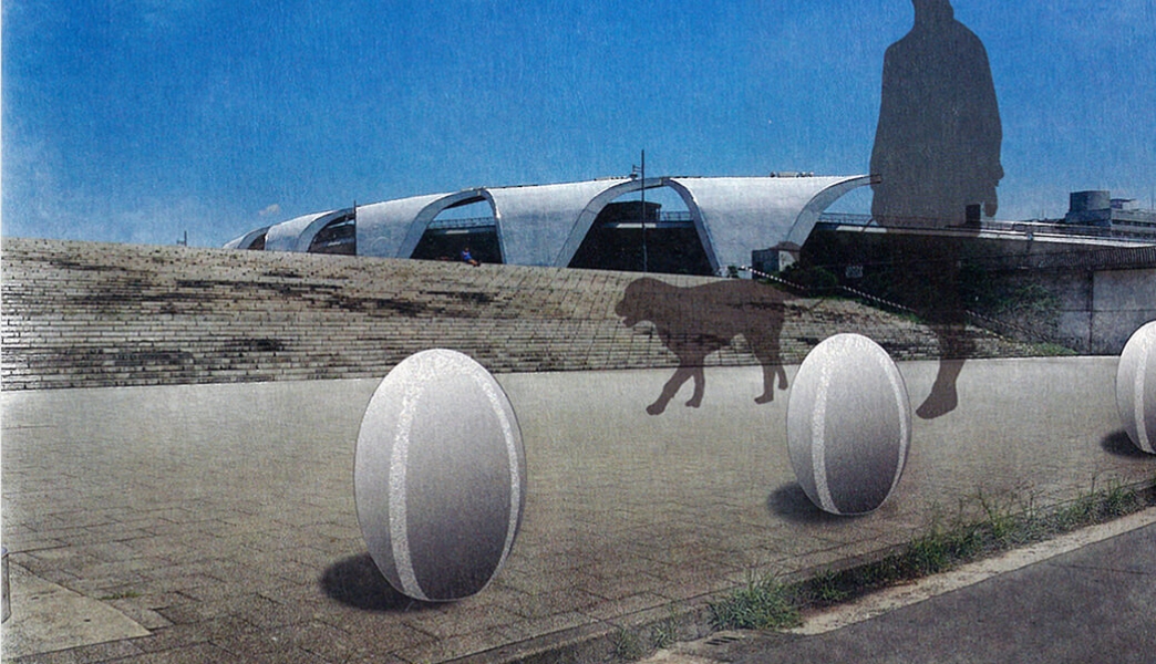 高耐久・長寿命のGRCを使用し、ラグビーボールを表現した車止めの製品イメージ。