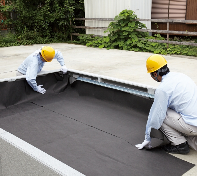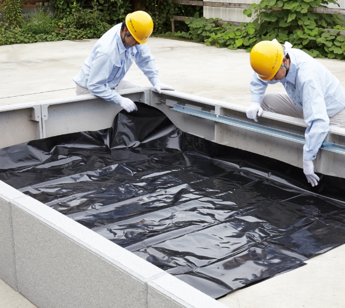耐根補助シートを敷きます。「耐根補助シート」は15cm程端を立ち上げてください。