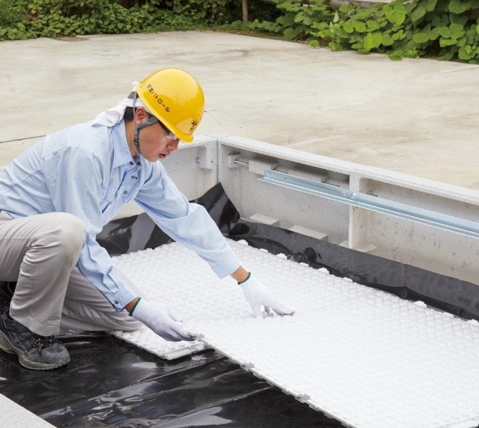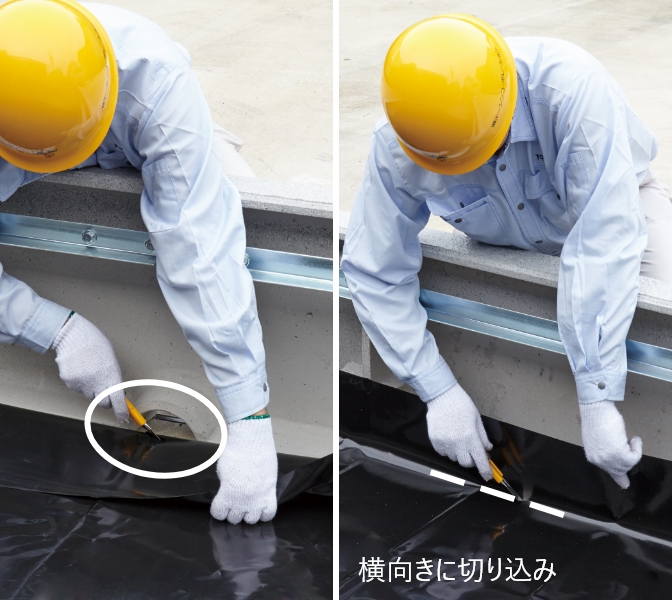 水がパネル外に抜けるように、耐根補助シートに切り込みを入れます。