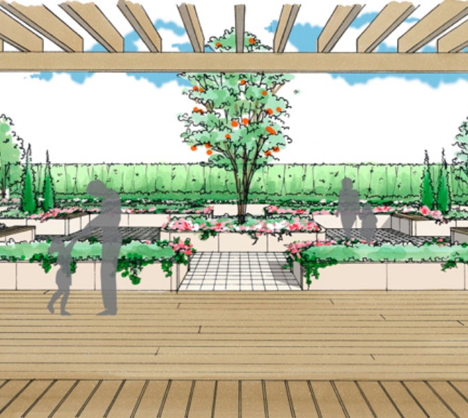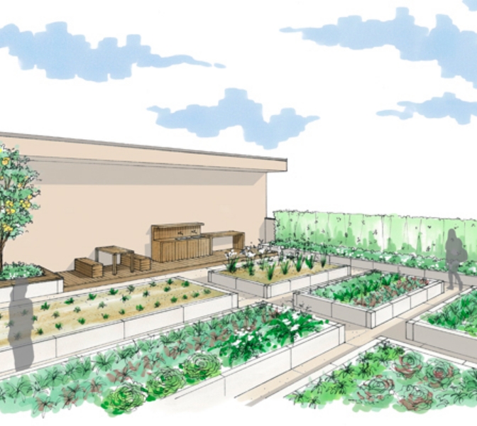 リフレッシュガーデンはハーブや果樹などを植えることで、剪定や採取を楽しめたり、木陰やベンチでくつろぐことができます。地域住民にリラクゼーションとおしゃれで豊かなコミュニティの場を提供します。