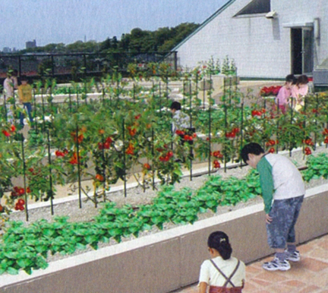 屋上で野菜を育てる場合、強風にさらされる場合が多いため、風よけに灌木などの生け垣を設ける必要があります。生け垣の植栽として果樹を選択すると、またひとつ収穫の楽しみが増えます。TLCパネルは深さが選べるため、さまざまな野菜の生育に適した環境が実現できます。高さ45cmのTLCパネルによる植栽基盤で、お子さま、高齢者の方にも、無理のない姿勢で野菜栽培を楽しんでいただけます。