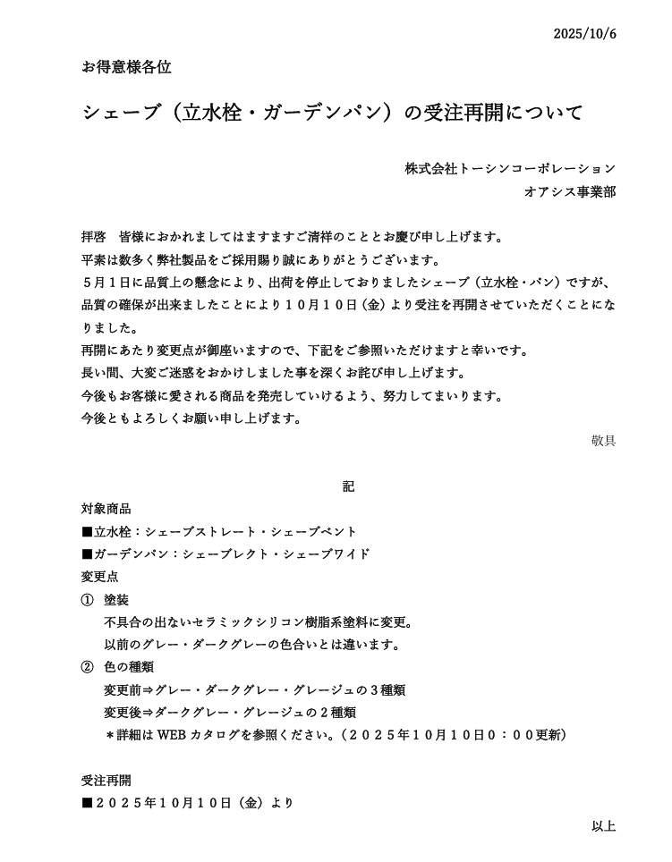 シェーブ(立水栓・ガーデンパン)の受注再開について