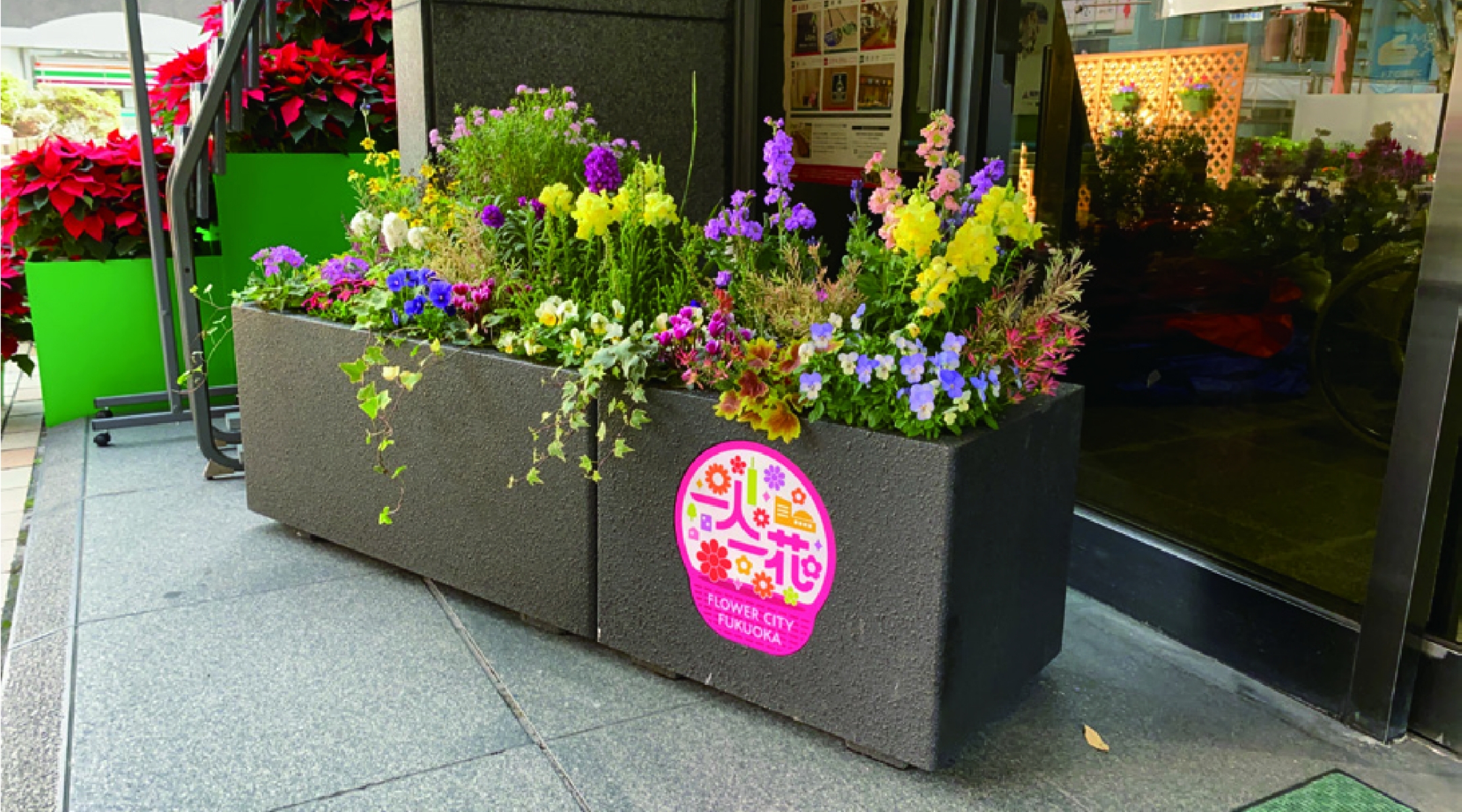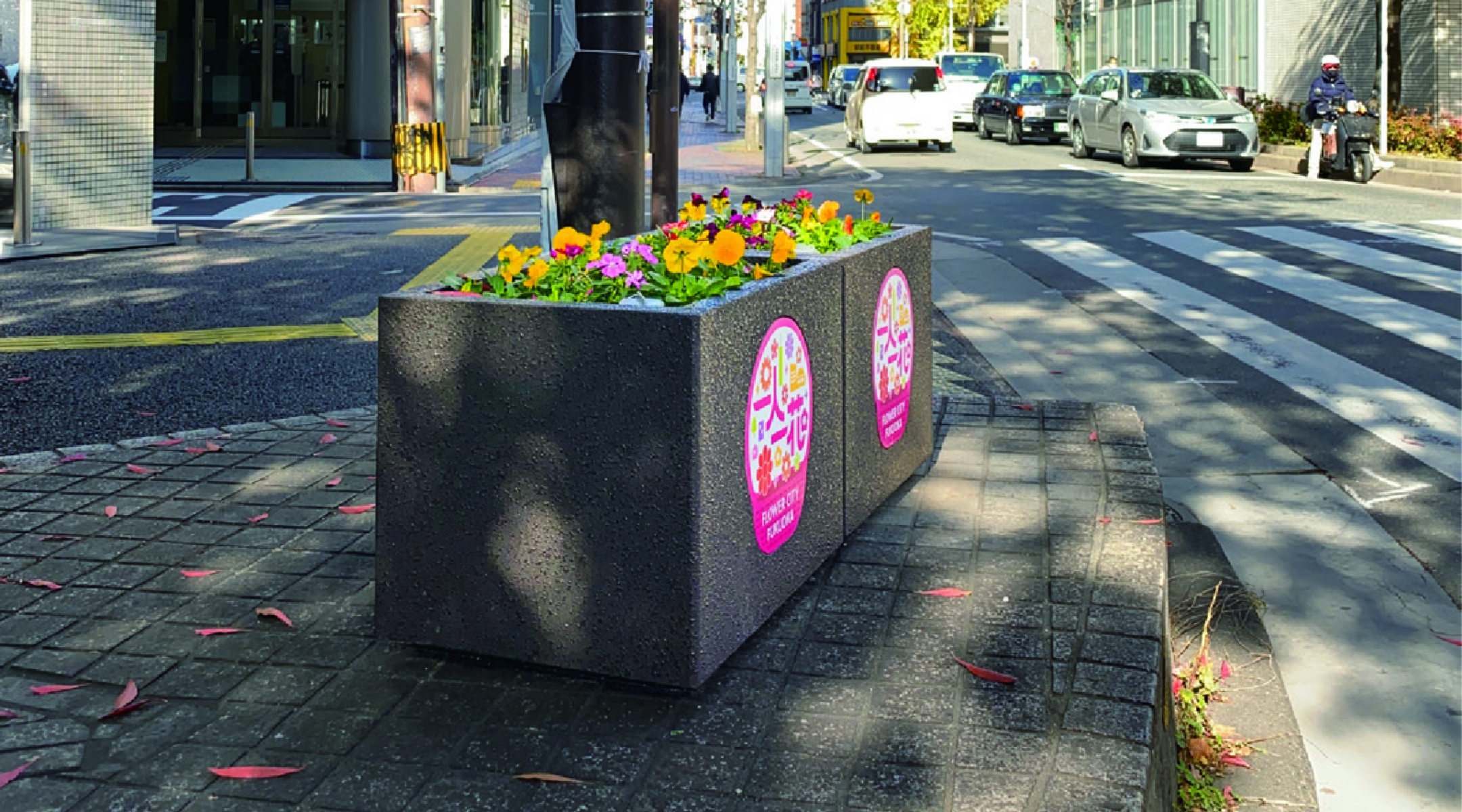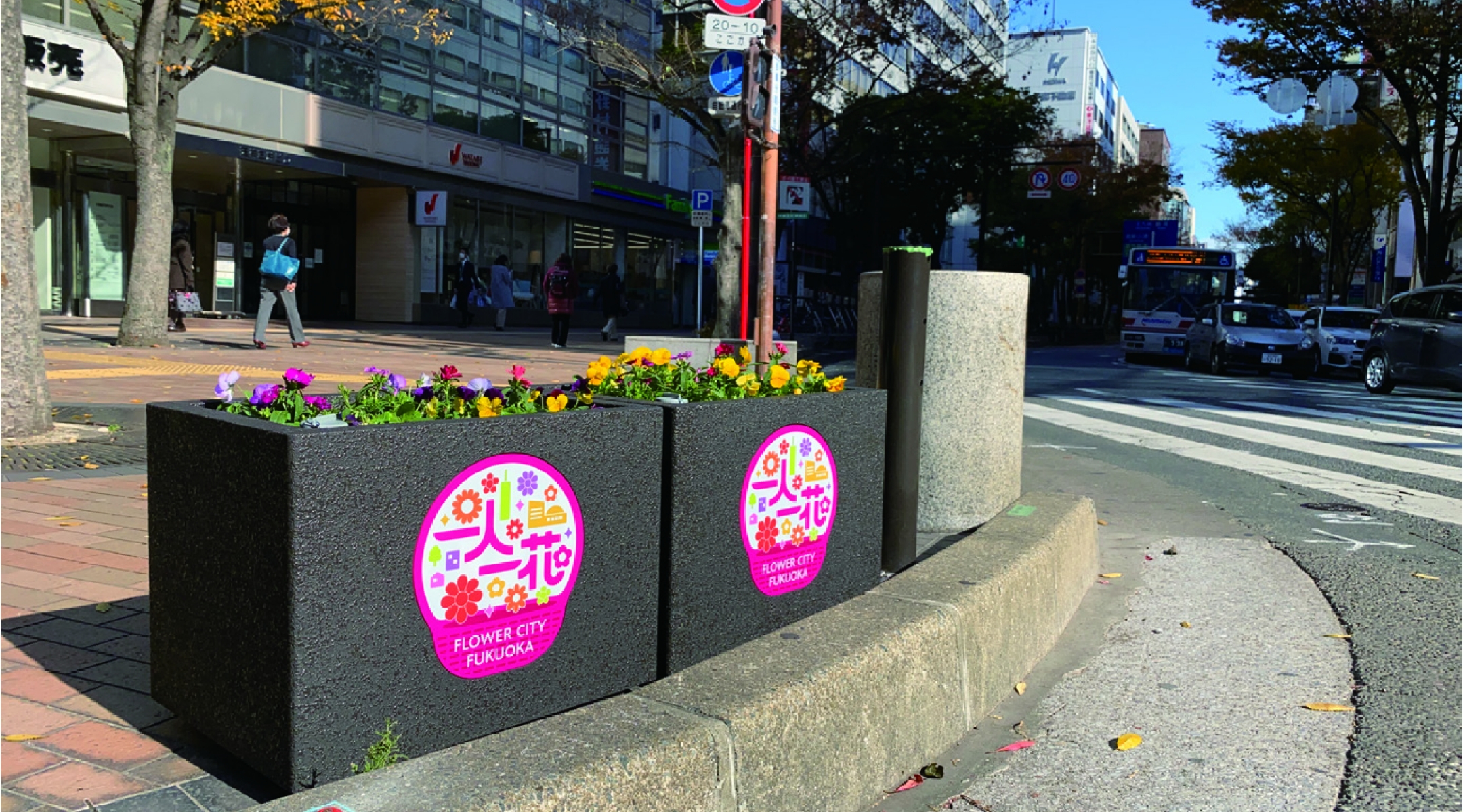 福岡市でスタートした「一人一花運動 」に合わせ、特注にてロゴ入りプレート付きGRCプランターを街中に設置。花の街「フラワーシティー福岡」による街づくりのプロジェクト。
